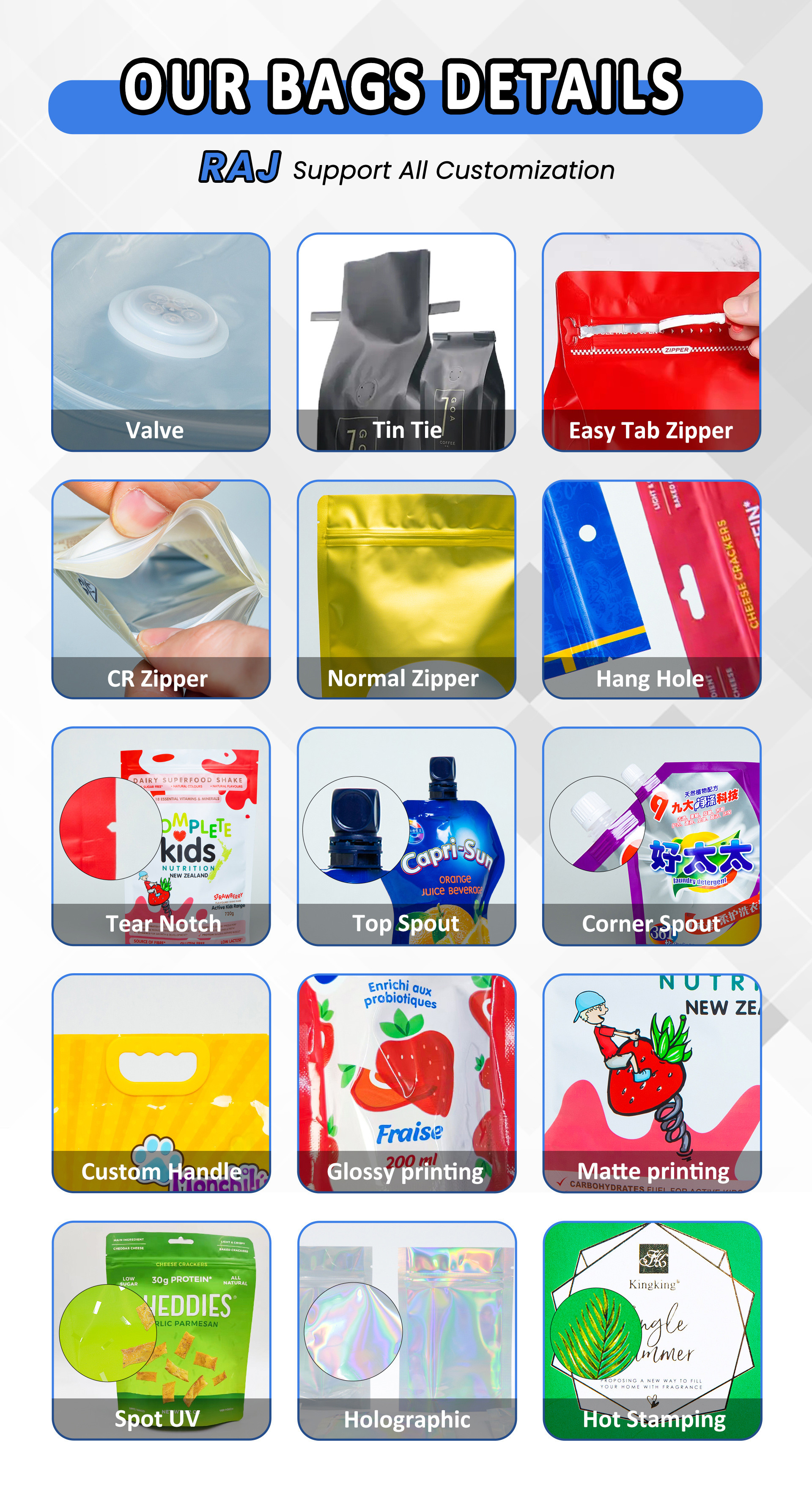 | Accessory Available | Ziplock, Pull Tab Zipper, Tear Notch, Hang Hole, etc. |
