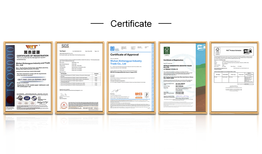 WUHAN XIN HENG YUE INDUSTRY CO.,LTD. was established in 2003, located in the Taiwanese Investment Zone of East West Lake District,Wuhan, Hubei Province, which is famous for the name of “ Nine-Province thoroughfare”, the Central of China. It is a modern industrial import & export enterprise that has mixture of manufacture and sales for the food packaging containers.The factory floor space totally approx.15000 square meters,about 200 workers, 20 more senior management and research personnel,and stable 20 sales team. The company own the advanced automated high speed lamination machines, nine-color flexo printing machines, high speed dividing and cutting machines, die-cutting machines, various of medium-high speed paper cups, paper bowls,salad plate make-up machines, and self-testing laboratory with complete set of equipment. etc.. it formed a whole production chain by environmental lamination, multi-color printing, and die-cutting, to passed the ISO9001, ISO14001, BRC Quality Management System Certification, achieved the “QS” production License, passed lots of authorized organizations testing such like CNAS,SGS,Intertek,etc...leading to obtain the international industry accreditation.